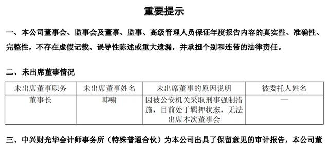 而在2024年报一开始的位置,即有重要提示:董事长韩啸因被公安机关采取刑事强制措施,目前处于羁押状态,无法出席本次董事会。审计机构再次出具了保留意见的审计报告(2022年起已连续3年被出具非标意见),而非“标准无保留意见”。